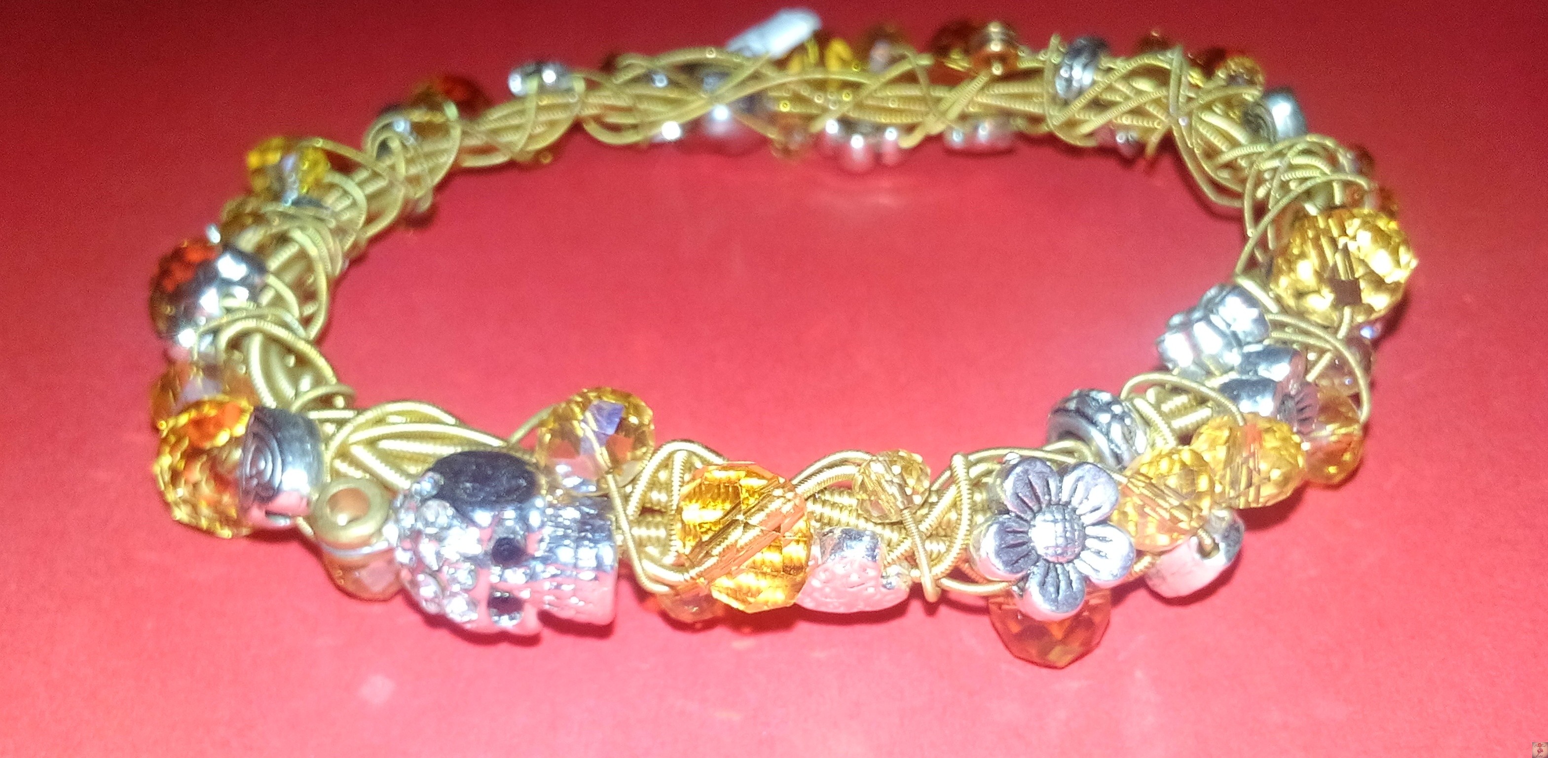 Stunning unique hand-crafted bracelet made from intricately woven guitar strings and adorned with amber gold beads, diamante skulls, and silver heart and flower charms.