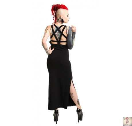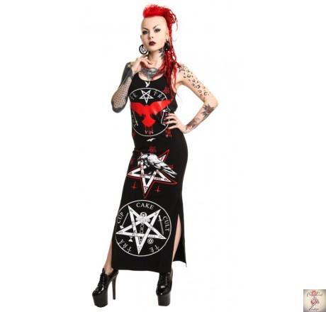 Dramatic and eye-catching long dress with side slits, bold graphics to the front and a fabulous pentacle-cross-over design to the back.