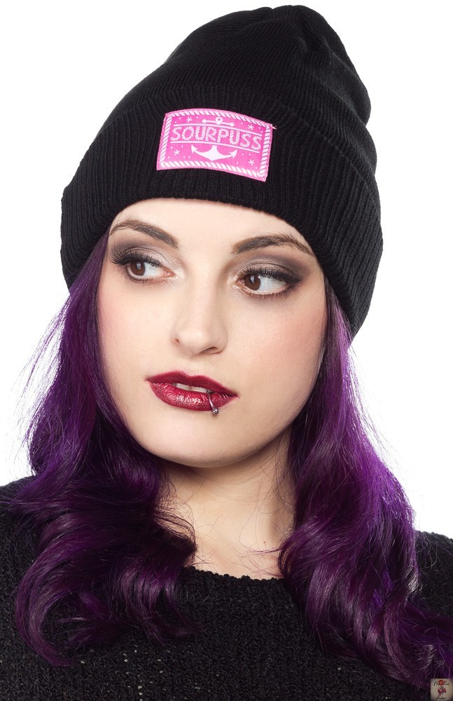 And if you are lookin' for that perfect basic black hat, here it is from Sourpuss! This black knit beanie with cuffed details has the Sourpuss & anchor logo embroidered on the front.